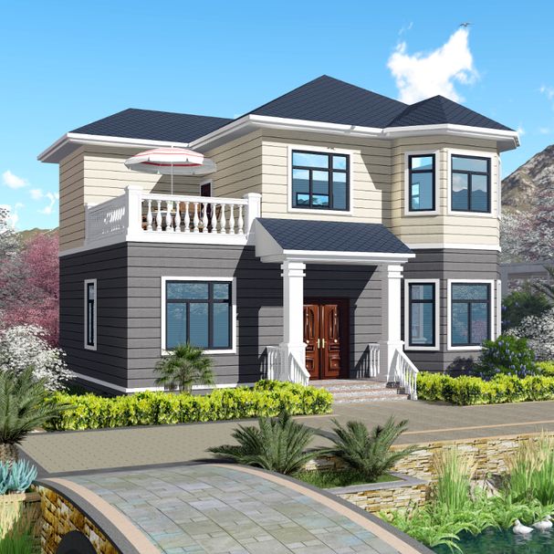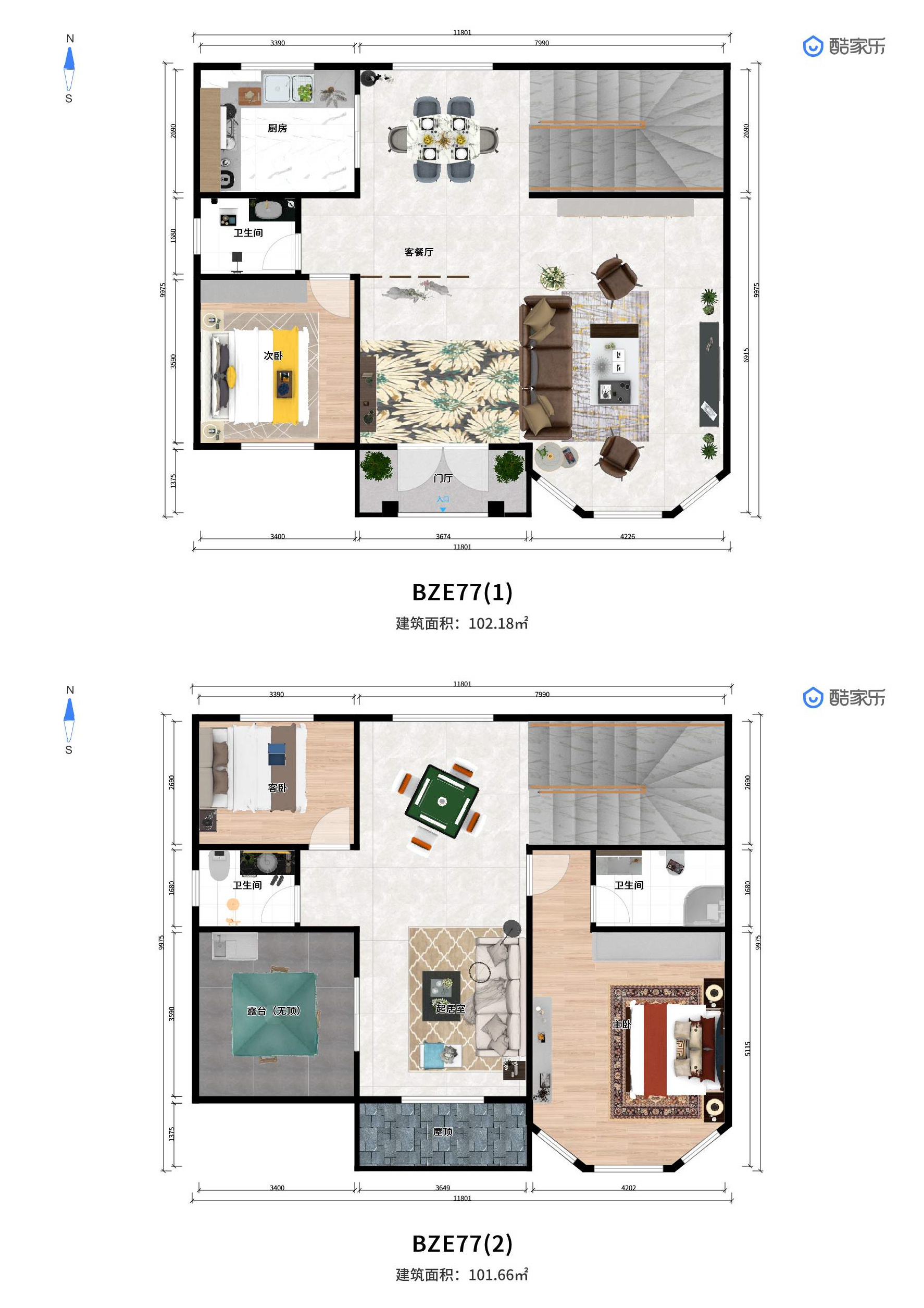 一层:客厅、餐厅、厨房、卧室x1、卫生间x1 二层:会客厅、卧室*2、卫生间*2