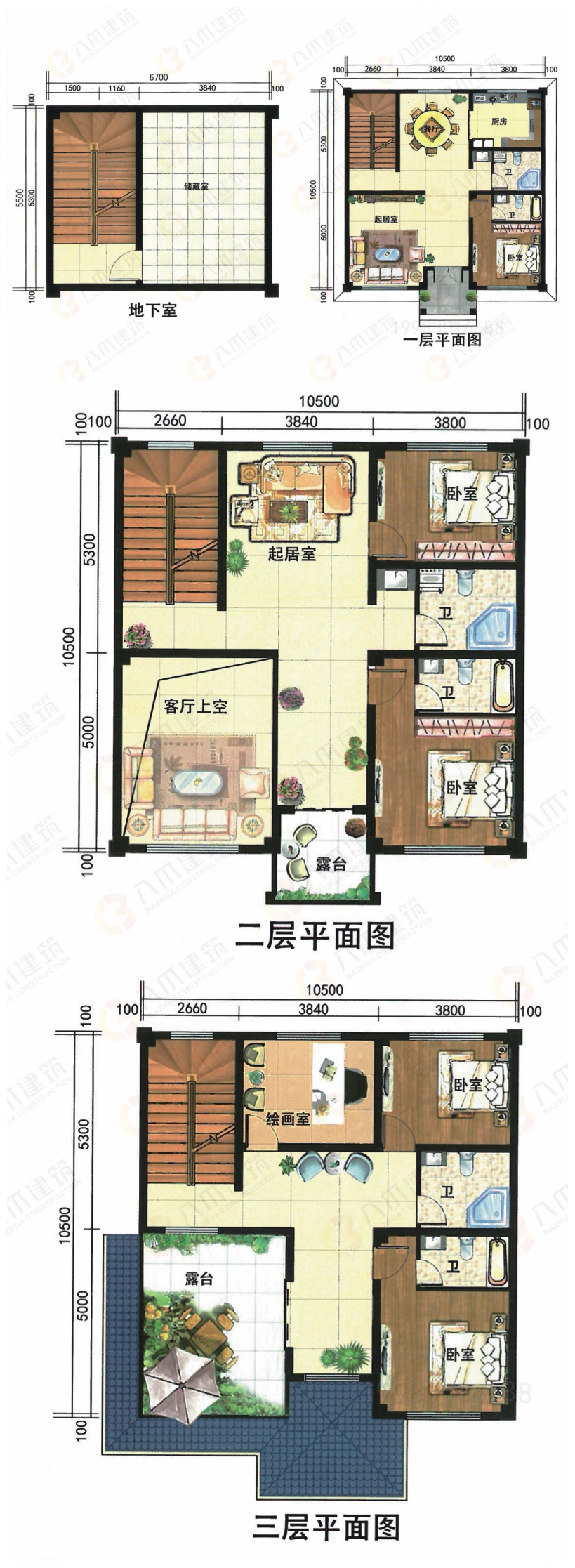 三层:绘画室、露台、卧室*2、卫生间*2、大露台