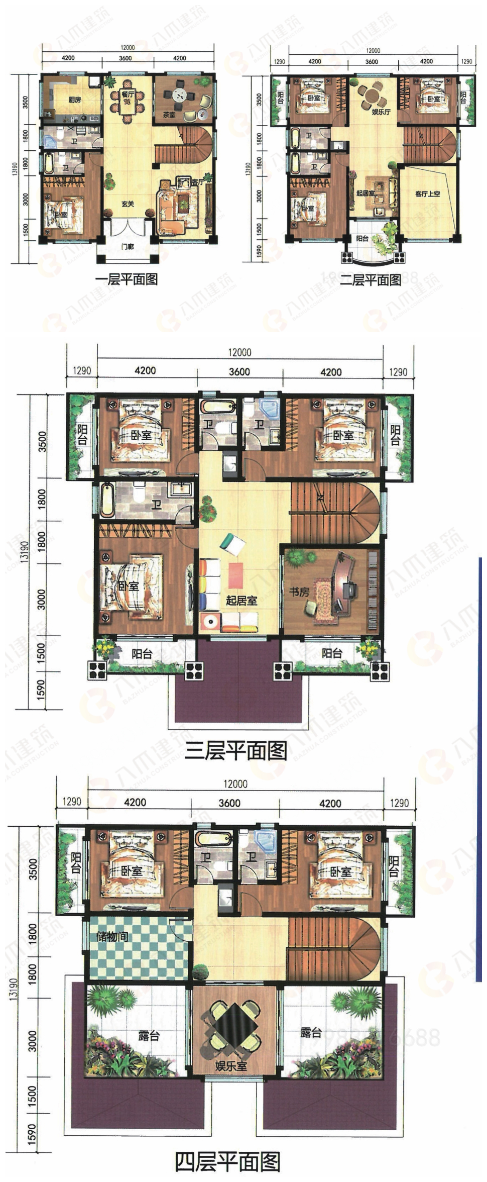 | 房屋功能 | 一层:客厅、餐厅、茶室、厨房、卧室、卫生间*2 二层:起居室、娱乐室、卧室*3、卫生间、阳台 三层:书房、起居室、卧室*3、卫生间*2、阳台*2 屋顶:娱乐室、储物间、卧室*2、卫生间*2、露台*2 |