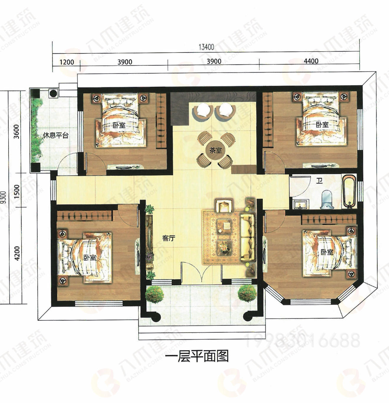 一层:客厅、餐厅、厨房、卧室x4、卫生间