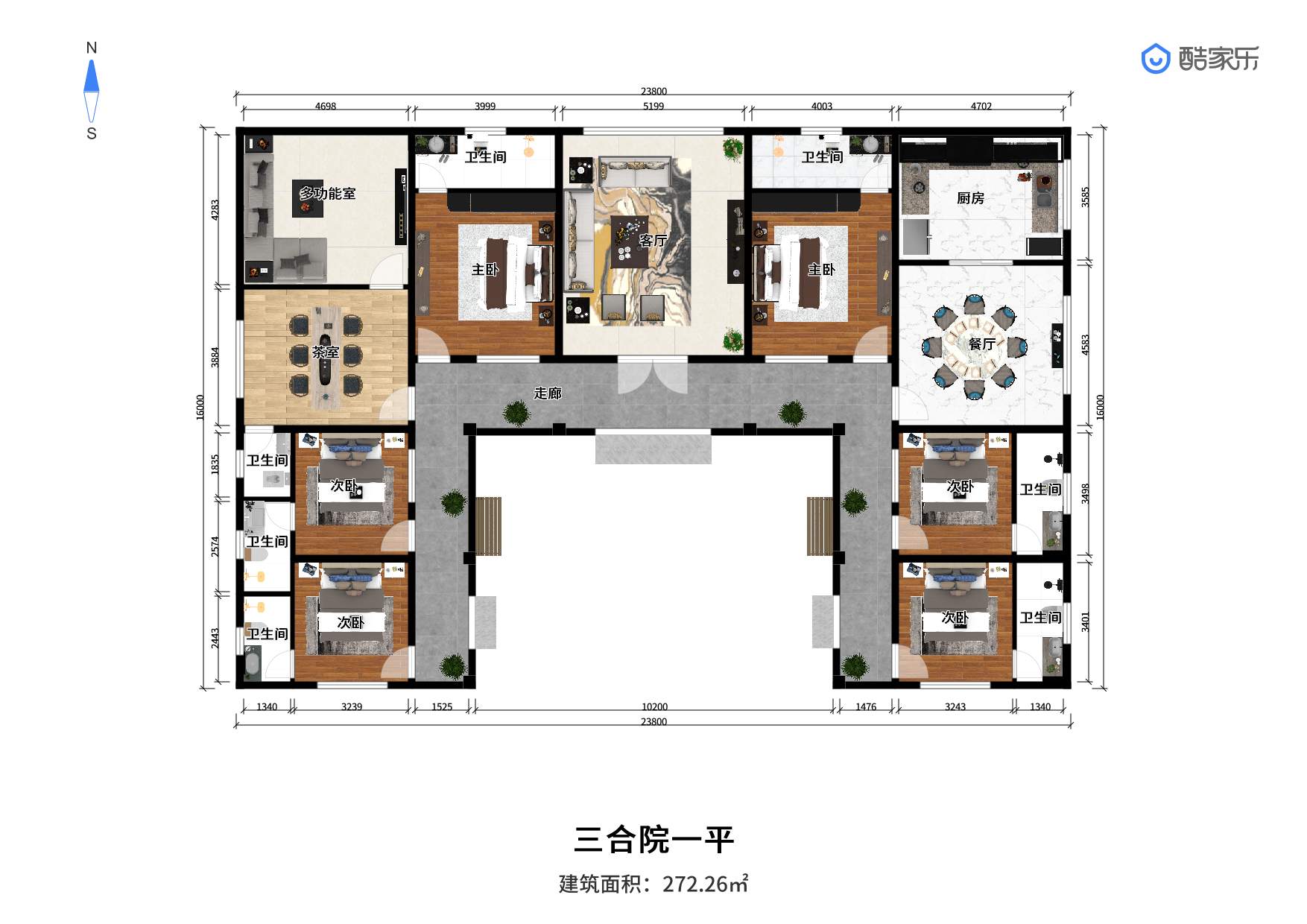 本户型为一层三合院轻钢别墅中式轻钢别墅,风味独特,别具一格