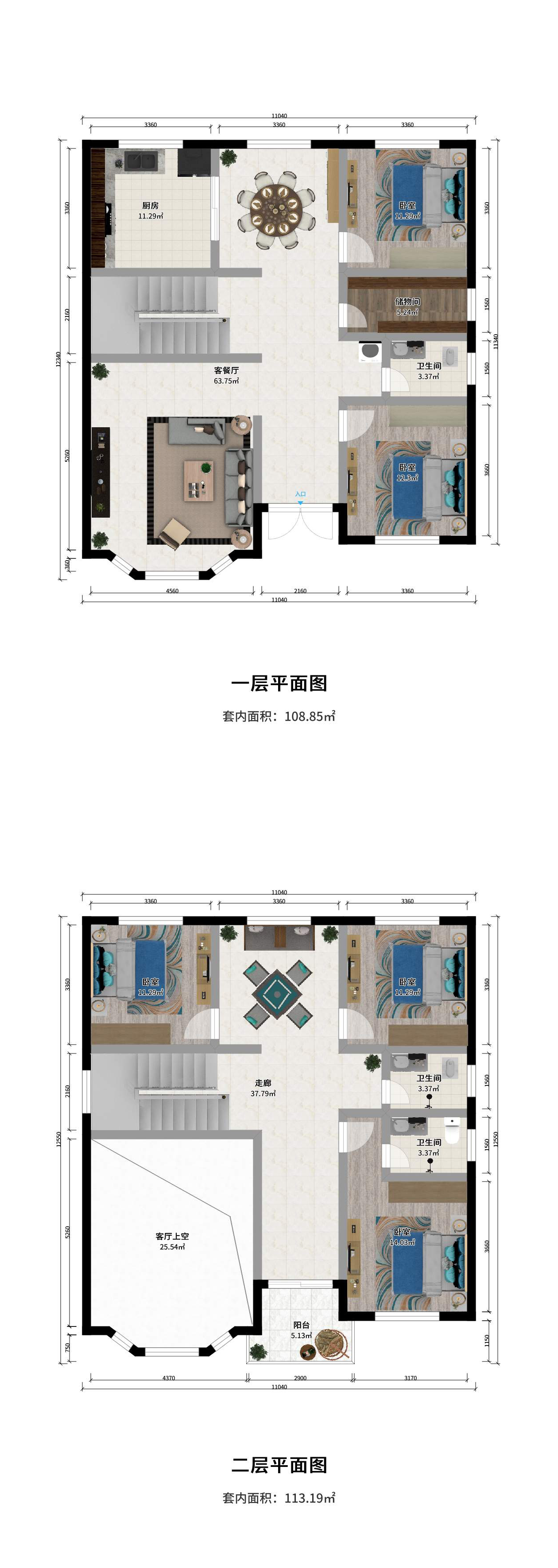 一层:客厅、餐厅、厨房、卧室x3、卫生间x1 二层:会客厅、卧室*3、卫生间*1