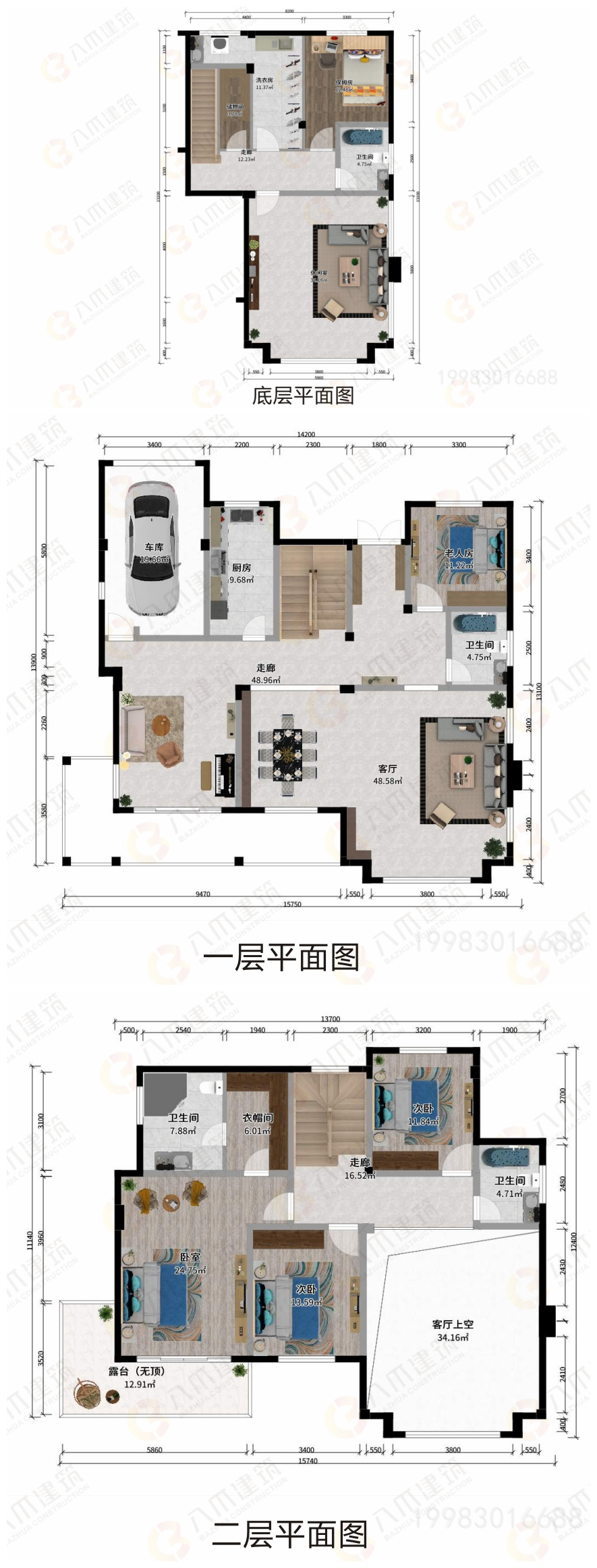 一层:客厅、餐厅、厨房、卧室x1、卫生间x1 二层:会客厅、衣帽间、卧室*3、卫生间*1
