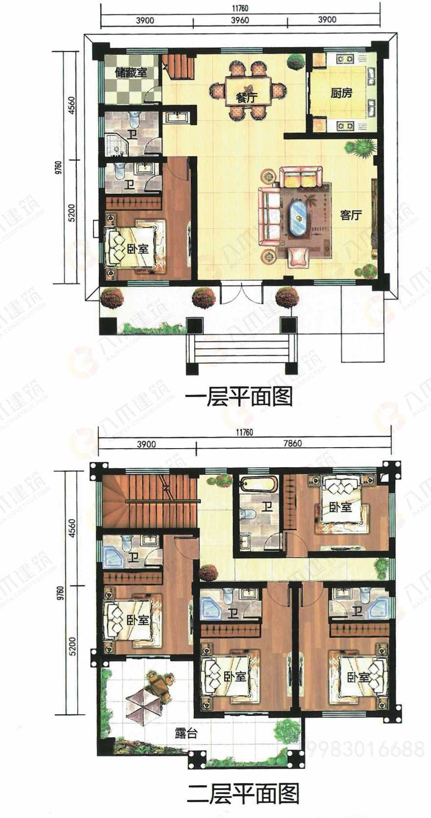一层:客厅、餐厅、厨房、卧室、卫生间x2 二层:会客厅、卧室*4、卫生间*2、露台