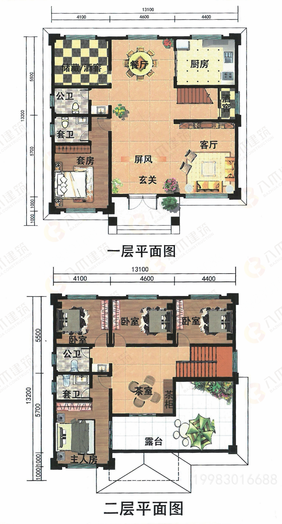 一层:客厅、餐厅、厨房、卧室、卫生间x2、储藏室 二层:茶室、卧室*4、卫生间*2、露台