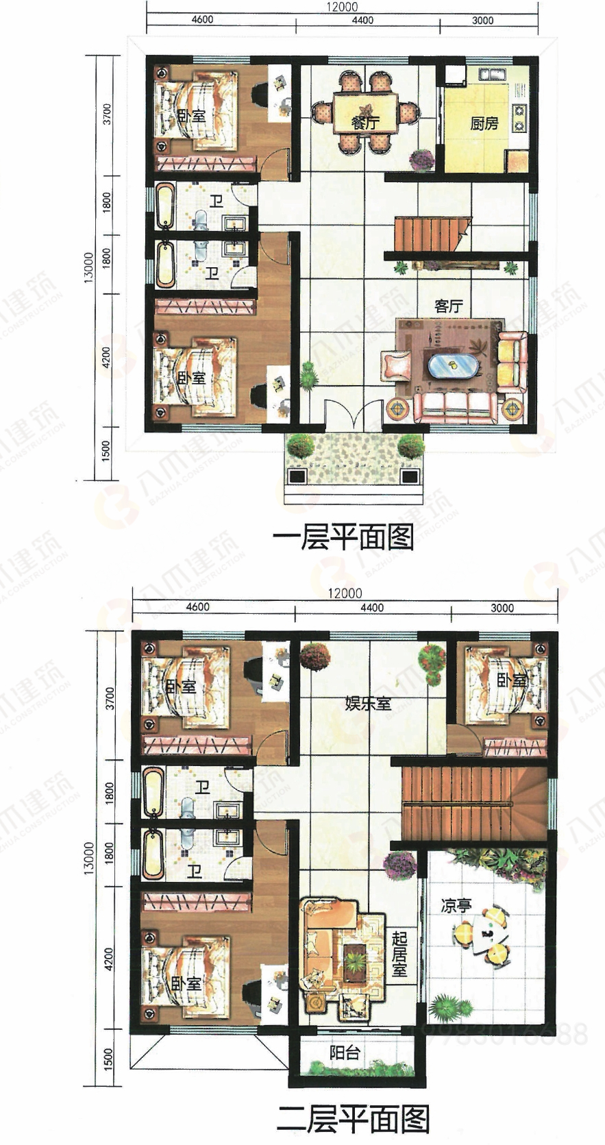 一层:客厅、餐厅、厨房、卧室x2、卫生间*2 二层:起居室、娱乐室、卧室*3、卫生间*2、凉亭
