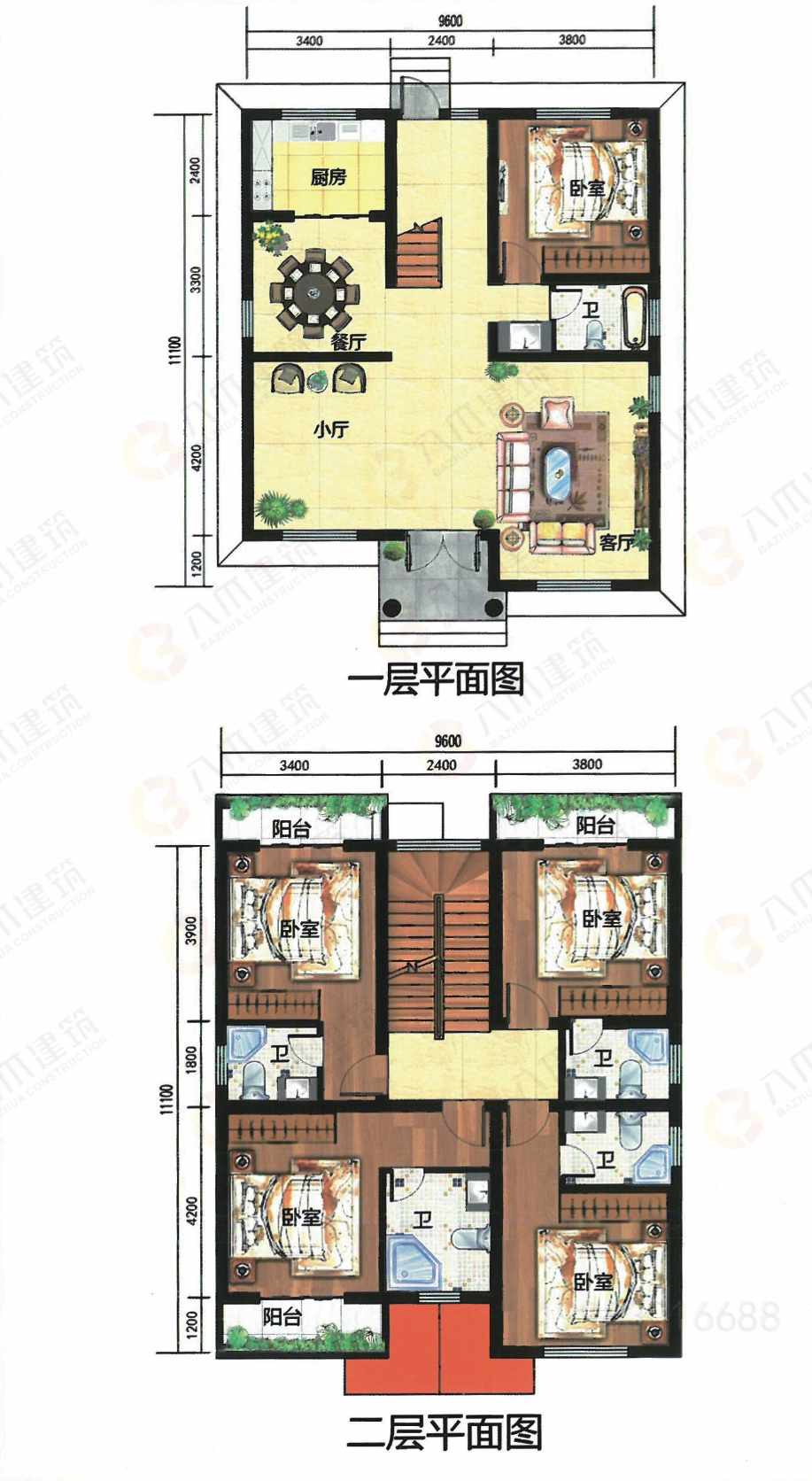 一层:客厅、餐厅、厨房、卧室、卫生间、小厅 二层:卧室*4、卫生间*4、阳台*3