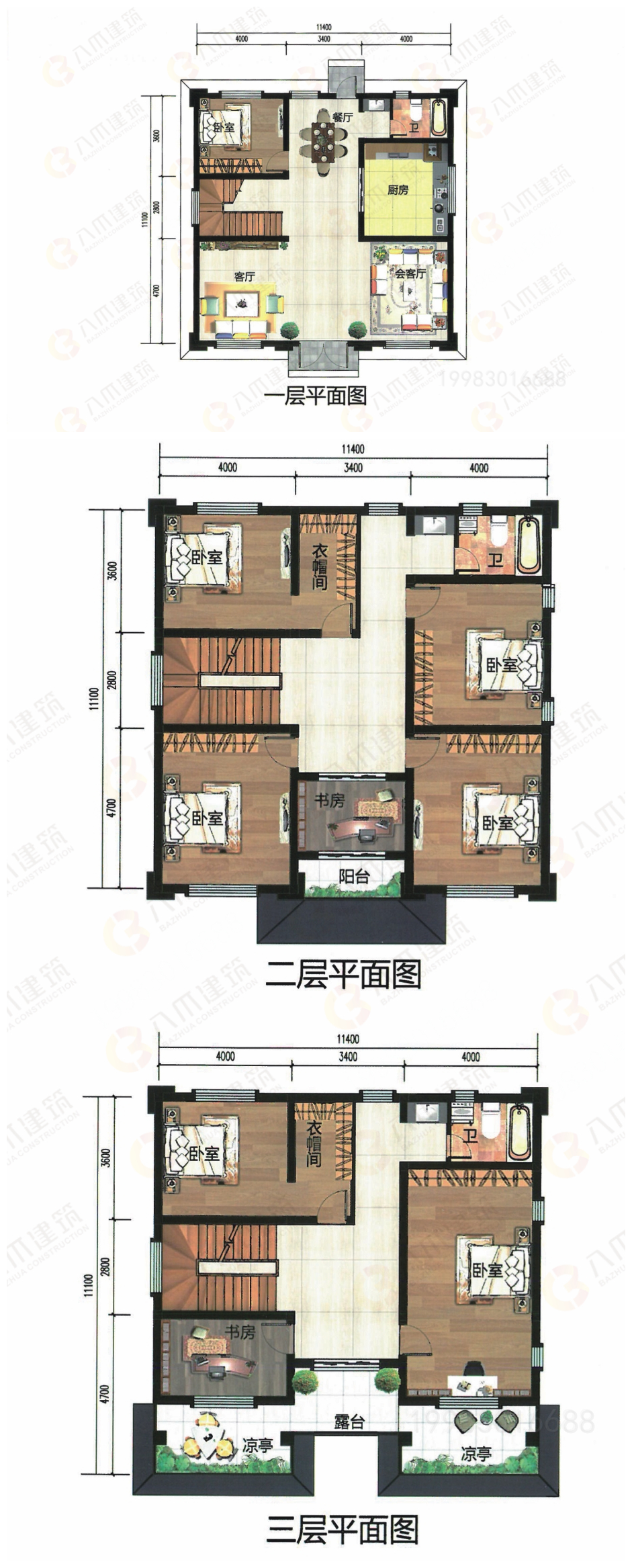 三层:衣帽间、书房、卧室*2、卫生间*1、露台、凉亭*2