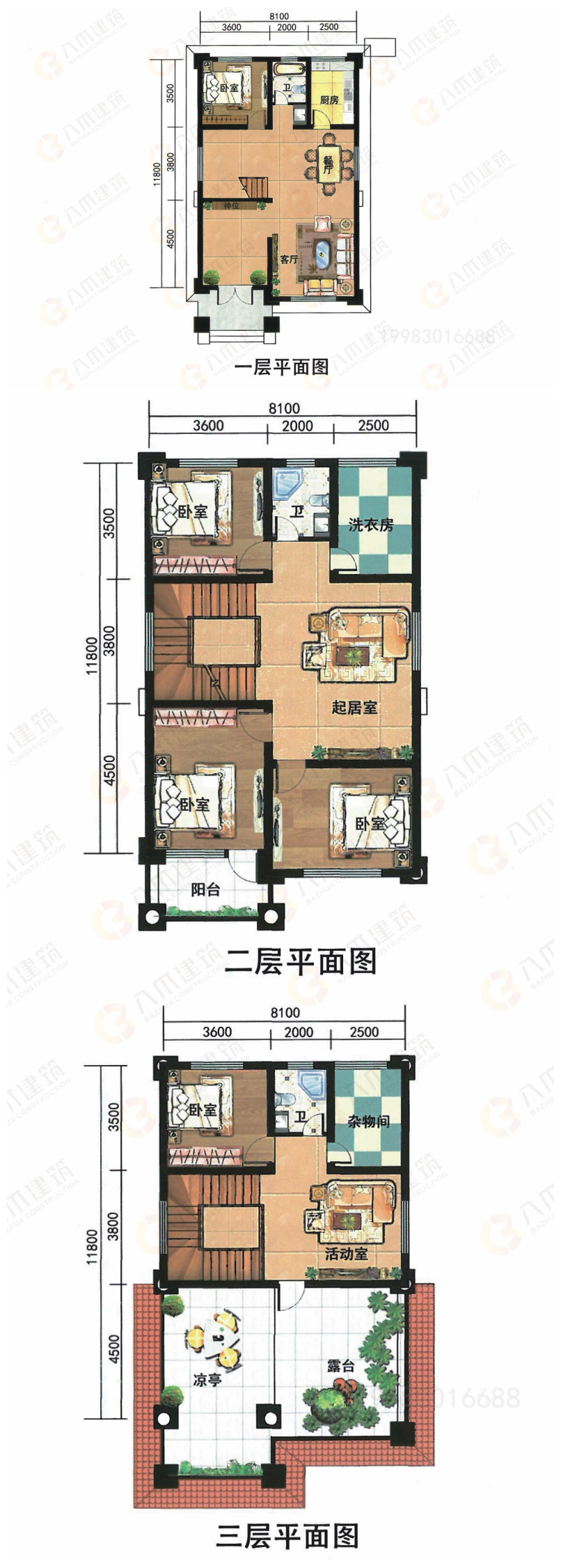 三层:杂物间、活动室、卧室、卫生间、大露台、凉亭