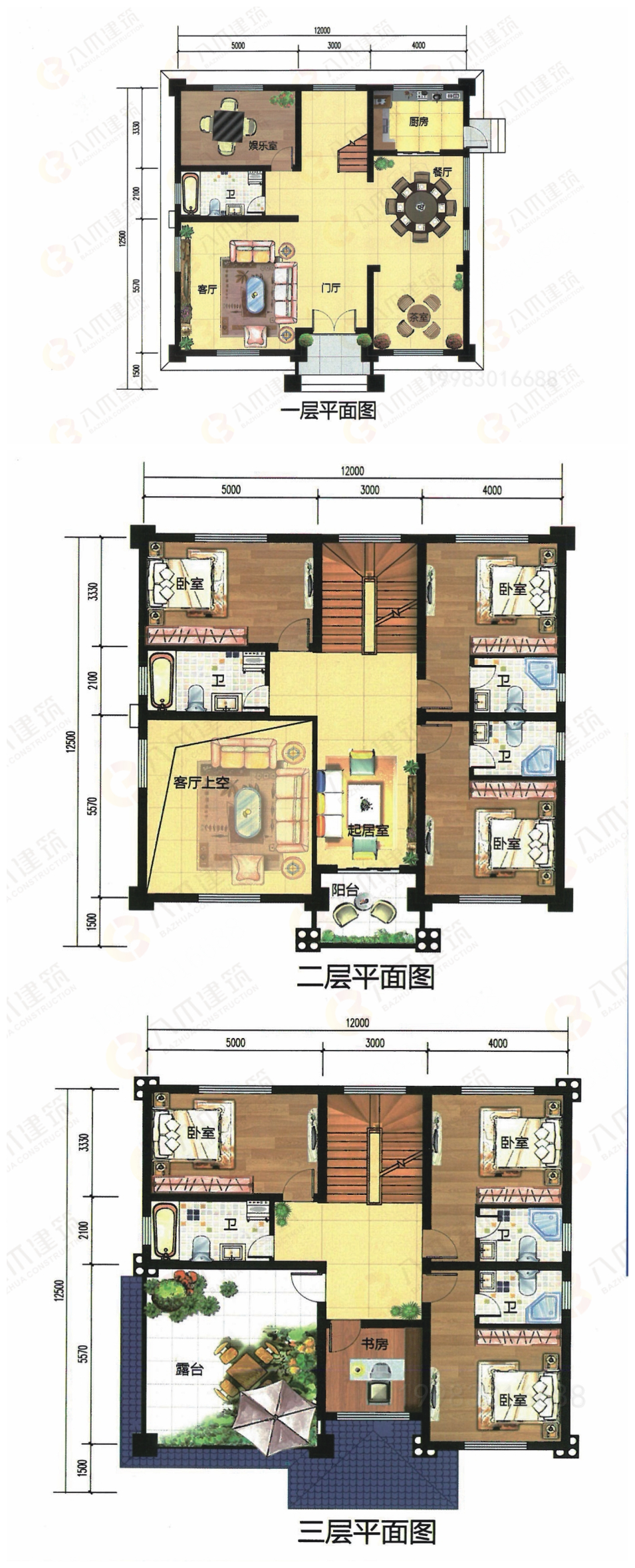 三层:书房、卧室*3、卫生间*3、大露台