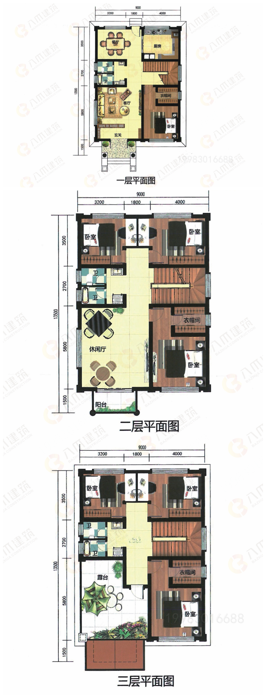 三层:衣帽间、卧室*3、卫生间*2、露台