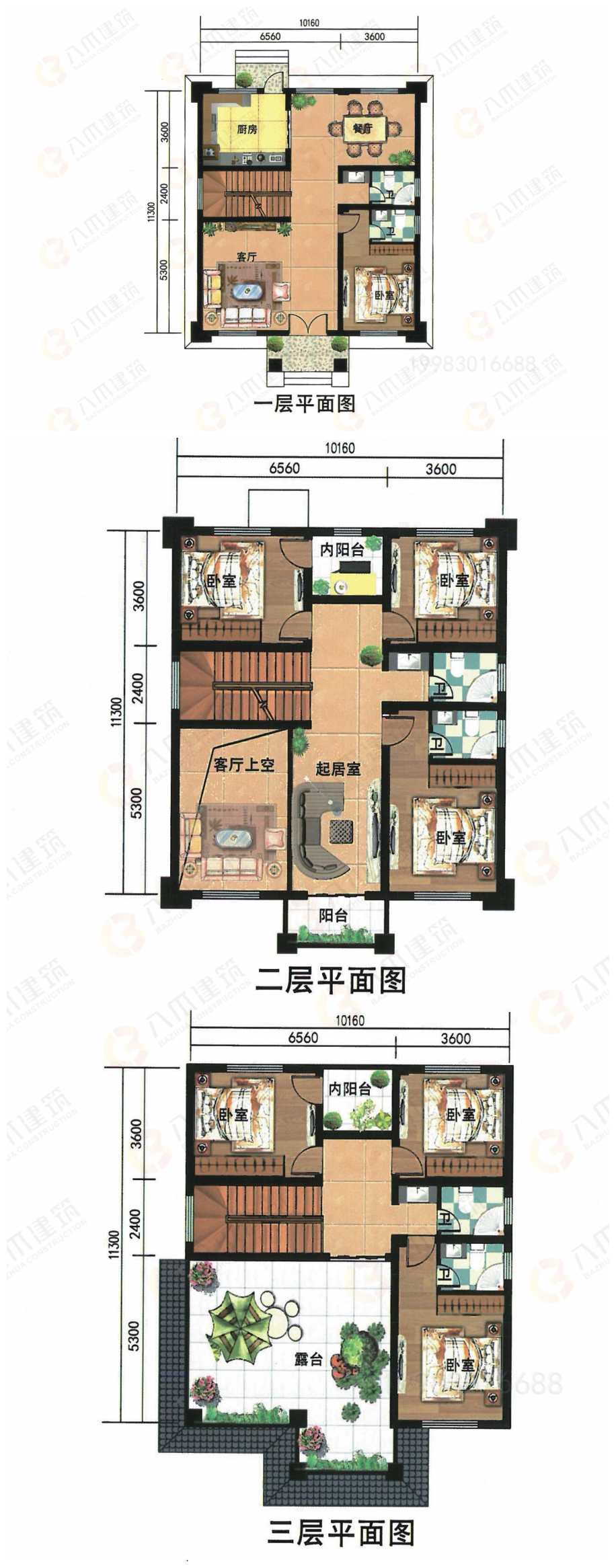 三层:卧室*3、卫生间*2、内阳台、大露台