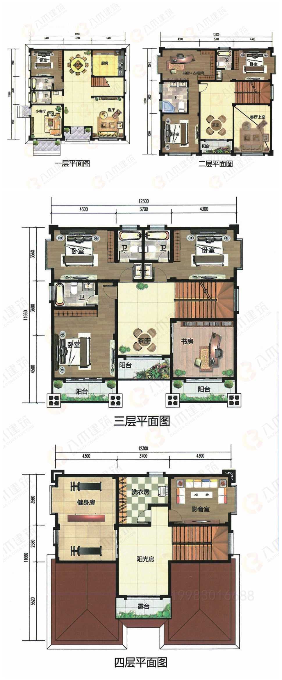 | 房屋功能 | 一层:客厅*2、餐厅、后厅、厨房、卧室、卫生间*2 二层:书房、茶室、卧室*2、卫生间*2 三层:书房、茶室、卧室*3、卫生间*3、阳台*3 屋顶:阳光房、健身房、影音室、洗衣房、露台 |