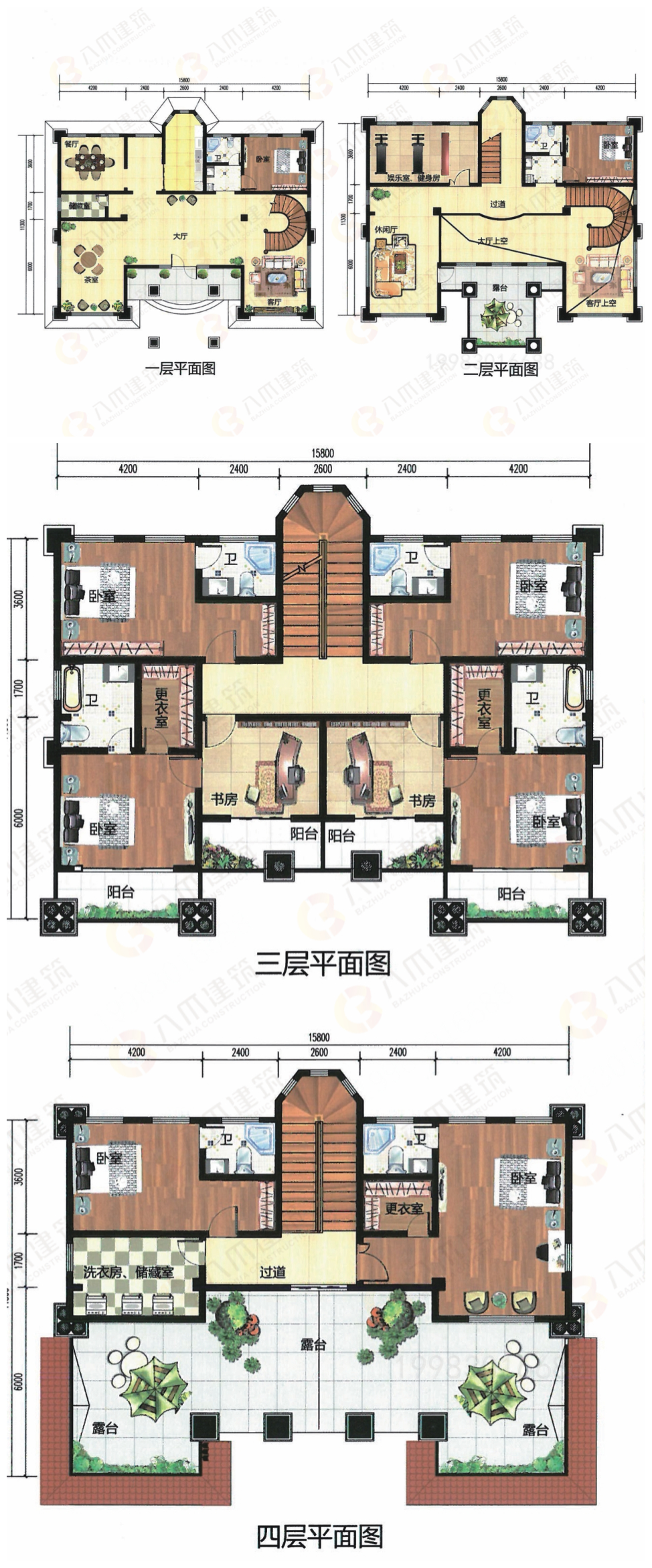 三层:书房*2、卧室*4、卫生间*4、阳台*4