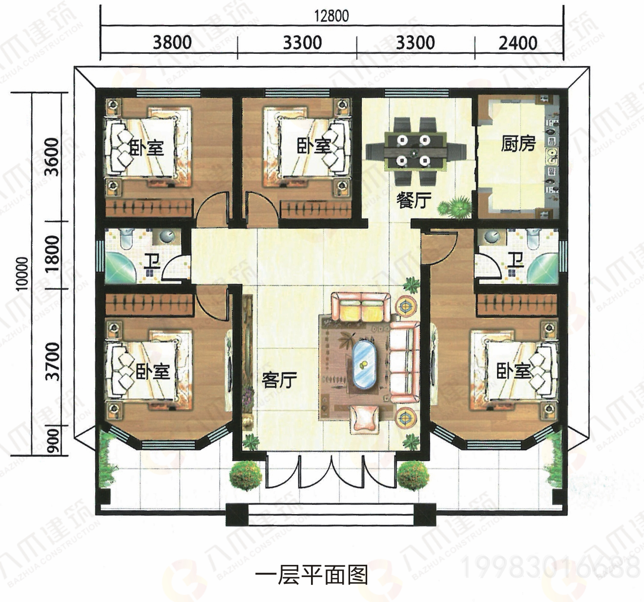 一层:客厅、餐厅、厨房、卧室x4、卫生间x2