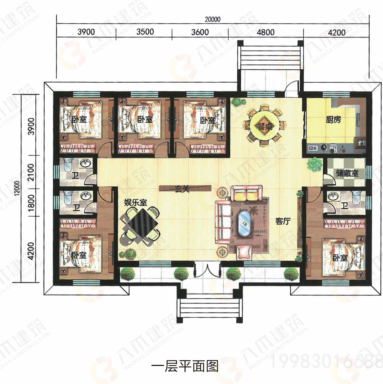 一层:客厅、餐厅、厨房、、活动室、卧室x5、卫生间x3