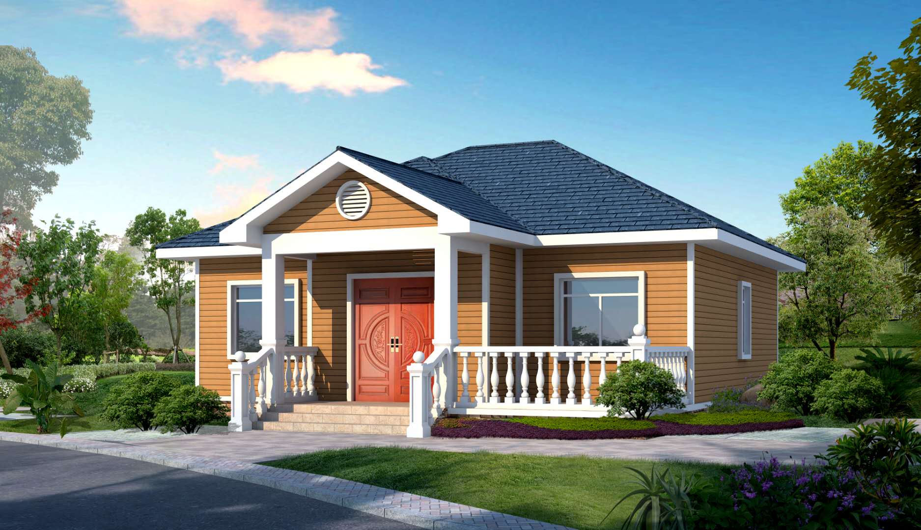 整体为轻钢结构,屋面沥青瓦+卷材防水(材料可选),木塑 挂板复合保温外墙(材料可选)实木内墙(材料可选),铝合 金门窗(材料可选)。